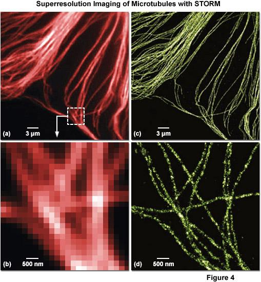 图 2. 庄小威发明的 STORM 超分辨光学成像效果图。a, b 为传统光学显微镜拍摄,c, d 为相同区域经 STORM 技术拍摄并重构。b, d 为 a, c 的局部放大。图中的结构是细胞内的支架——微管蛋白。图片来自 Nikon MicroscopyU 。