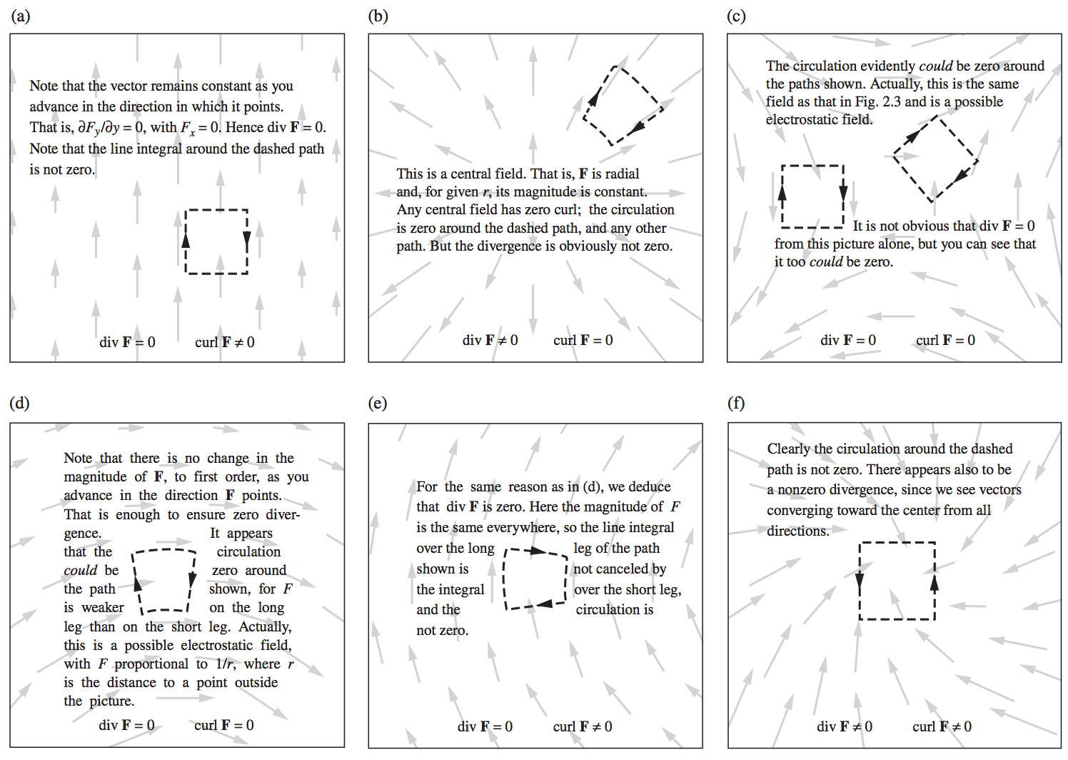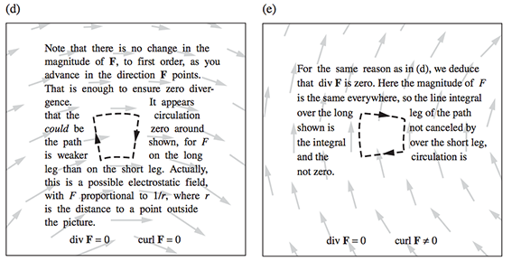 Figure 2.39和2.40对于直观理解散度和旋度的物理意义很有帮助. 下面完整给出, 作为其他回答的补充: