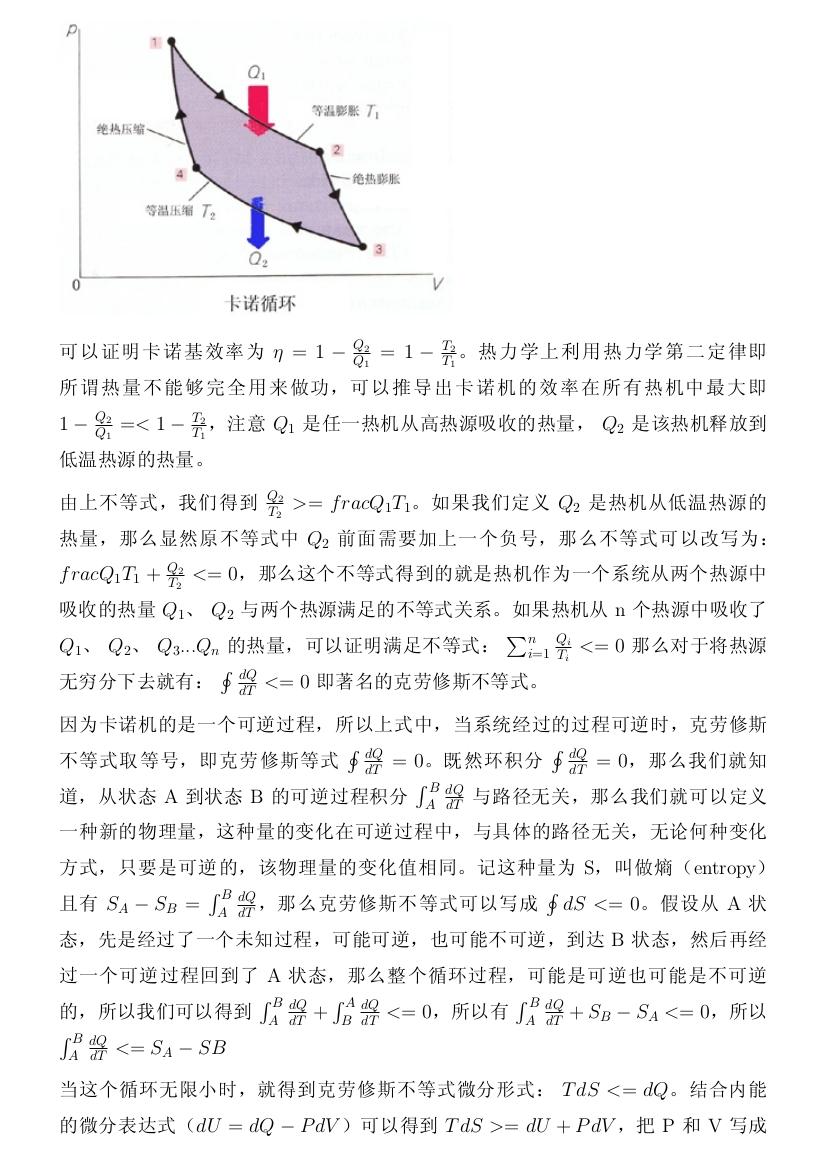$\sum_{i=1}^{n}\frac{Q_i} {T_i}<=0$那么对于将热源无穷分下去就有:$\oint \frac{dQ}{dT}<=0$即著名的克劳修斯不等式。