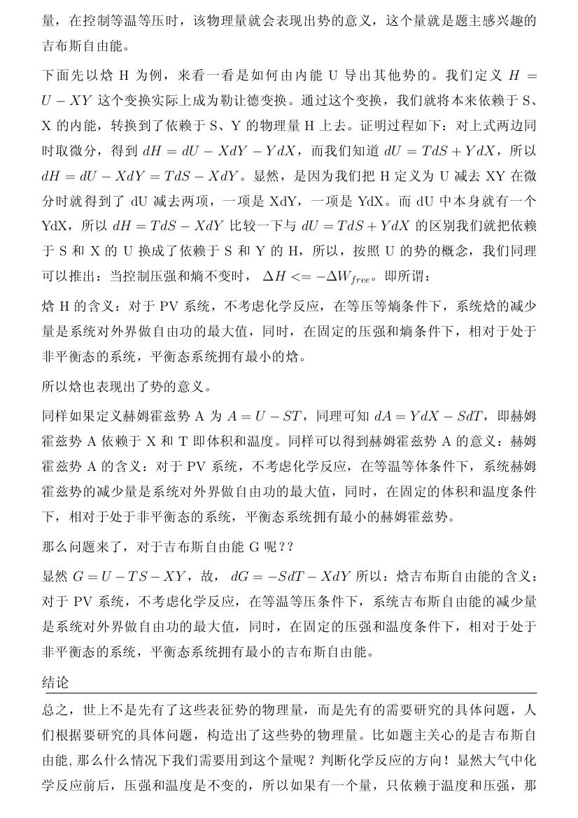 同理我们可以推出依赖于T、Y,即在PV系统中依赖于温度T和压强P的物理量,在控制等温等压时,该物理量就会表现出势的意义,这个量就是题主感 兴趣的吉布斯自由能。