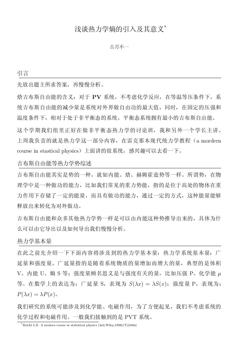 其实物理量的物理意义都是人为赋予的,引入某一物理量大多是为了更好的解释物理现象或者是更好的进行量化计算。G的单位是什么?J,竟然是能量单位?那么我们是不是可以将其理解为一种特殊能量?干嘛用的?指明变化方向啊。为嘛荷叶上的水滴是球状?表面G,最小啊。为什么会发生化学变化?G,变小啊?这样回答似乎在耍流氓,但是你要想它怎么变小呢?不要只看到公式,要看到公式背后的现象。不等号是什么,不等号表示的是方向,等号是什么?等号表示的是平衡?熵增原理是有条件的,热寂说他所谓的系统可以看做孤立的嘛?房间脏了总会被打扫,有人犯罪但还有的会被抓。毕竟房间不会成为垃圾场, 小偷不会无休止增加。玻尔兹曼自杀是他的问题,总认为自己不被接受,学生听不懂他的理论,其实现在研究生听懂课确实不很多吧。先这样,睡觉。