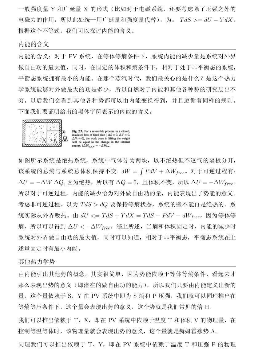 内能的含义:对于PV系统,在等体等熵条件下,系统内能的减少量是系统对外界做自由功的最大值,同时,在固定的体积和熵条件下,相对于处于 非平衡态的系统,平衡态系统拥有最小的内能。在那个蒸汽时代,我们最关心的是什么?是这个热力学系统能够对外做最大的功是多少,所以自然对于内能和其他各种势的研究层出不穷。以后我 们会看到其他各种势都可以由内能变换得到,并且遵循着同样的规则。