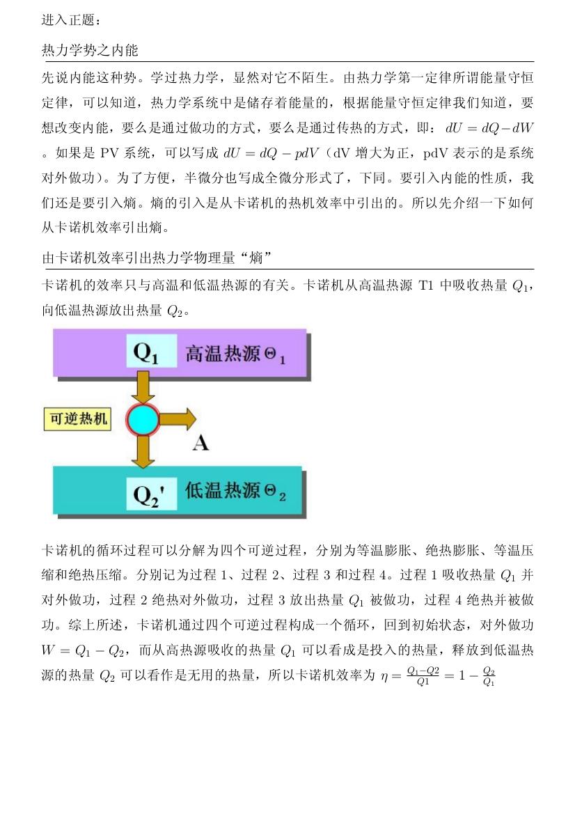 先 说内能这种势。学过热力学,显然对它不陌生。由热力学第一定律所谓能量守恒定律,可以知道,热力学系统中是储存着能量的,根据能量 守恒定律我们知道,要想改变内能,要么是通过做功的方式,要么是通过传热的方式,即:$dU=dQ-dW$ 。如果是PV系统,可以写成$dU=dQ-pdV$(dV增大为正,pdV表示的是系统对外做功)。为了方便,半微分也写成全微分形式了,下同。要引入内能的性质,我们还是要引入熵。熵的引入是从卡诺机的热机效率中引出的。所以先介绍一下如何从卡诺机效率引出熵。