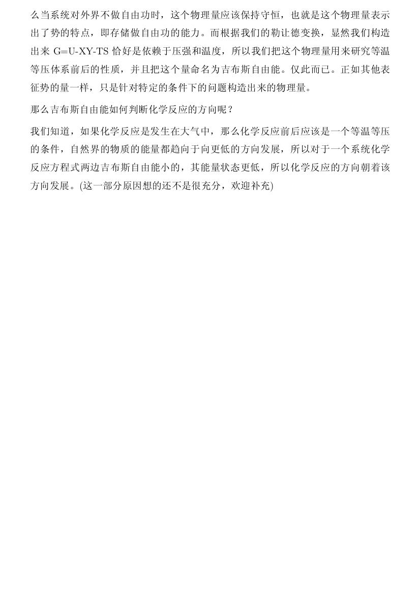 那么吉布斯自由能有什么用?判断化学反应的方向!我 们知道,如果化学反应是发生在大气中,那么化学反应前后应该是一个等温等压的条件,自然界的物质的能量都趋向于向更低的方向发展,所以对于一个系 统化学反 应方程式两边吉布斯自由能小的,其能量状态更低,所以化学反应的方向朝着该方向发展。(这一部分原因想的还不是很充分,欢迎补充)