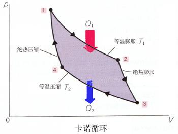 可以证明卡诺基效率为$\eta=1-\frac{Q_2}{Q_1}=1-\frac{T_2}{T_1}$。热力学上利用热力学第二定律即所谓热量不能够完全用来做功,可以推导出卡诺机的效率在所有热机中最大即$1-\frac{Q_2}{Q_1}=<1- \frac{T_2} {T_1}$,注意$Q_1$是任一热机从高热源吸收的热量,$Q_2$是该热机释放到低温热源的热量。